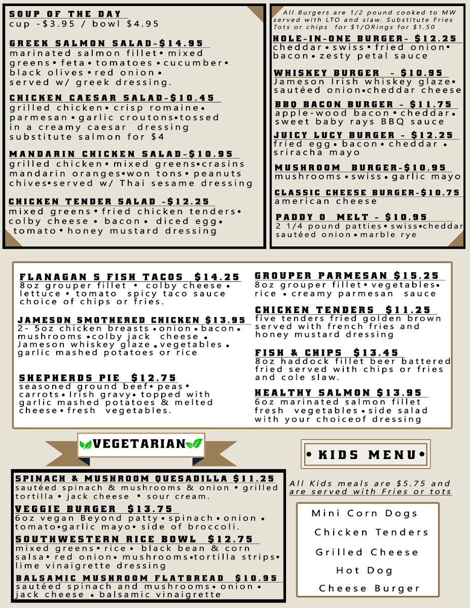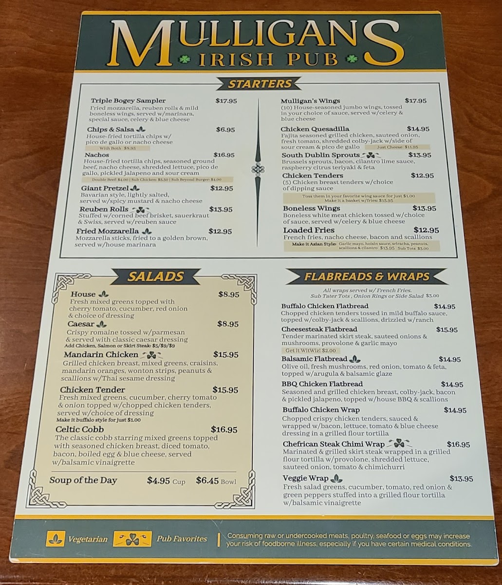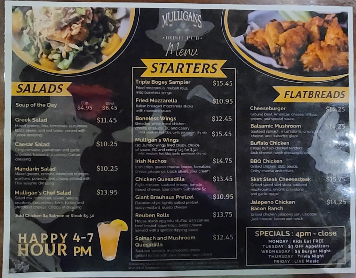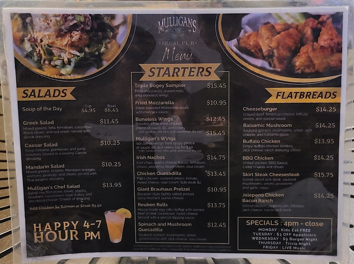 Mulligans Irish Pub, located at 23253 Plantation Palms Blvd, Land O' Lakes, FL, offers a vibrant culinary adventure that feels both inviting and authentically Irish. Featured dishes include crispy Fish & Chips, hearty nachos loaded with beef, and flavorful steak and cheese flatbreads. These items showcase a commitment to quality, as noted by patrons who rave about the excellent service and the delightful atmosphere.